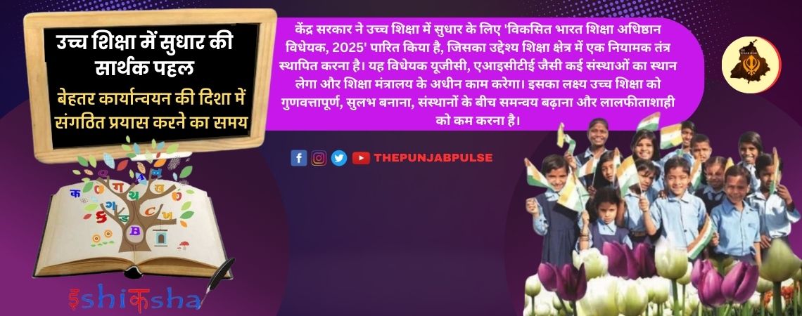 बेहतर कार्यान्वयन की दिशा में संगठित प्रयास करने का समय केंद्र सरकार ने उच्च शिक्षा में सुधार के लिए 'विकसित भारत शिक्षा अधिष्ठान विधेयक, 2025' पारित किया है, जिसका उद्देश्य शिक्षा क्षेत्र में एक नियामक तंत्र स्थापित करना है। यह विधेयक यूजीसी, एआइसीटीई जैसी कई संस्थाओं का स्थान लेगा और शिक्षा मंत्रालय के … Continue reading about उच्च शिक्षा में सुधार की सार्थक पहल