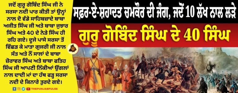 ਜਦੋਂ ਗੁਰੂ ਗੋਬਿੰਦ ਸਿੰਘ ਜੀ ਨੇ ਸਰਸਾ ਨਦੀ ਪਾਰ ਕੀਤੀ ਤਾਂ ਉਨ੍ਹਾਂ ਨਾਲ ਦੋ ਵੱਡੇ ਸਾਹਿਬਜ਼ਾਦੇ ਬਾਬਾ ਅਜੀਤ ਸਿੰਘ ਜੀ ਅਤੇ ਬਾਬਾ ਜੁਝਾਰ ਸਿੰਘ ਅਤੇ 40 ਦੇ ਨੇੜੇ ਸਿੰਘ ਹੀ ਰਹਿ ਗਏ। ਦੂਜੇ ਪਾਸੇ ਸਰਸਾ ਤੋਂ ਵਿੱਛੜ ਕੇ ਮਾਤਾ ਗੁਜਰੀ ਜੀ ਨਾਲ ਸੱਤ ਅਤੇ ਨੌਂ ਸਾਲਾਂ ਦੇ ਬਾਬਾ ਜ਼ੋਰਾਵਰ ਸਿੰਘ ਅਤੇ ਬਾਬਾ ਫਤਿਹ ਸਿੰਘ ਜੀ ਆਪਣੀ ਨਿੱਕੀਆਂ ਉਂਗਲਾਂ ਨਾਲ … [Read more...] about ਸਫ਼ਰ-ਏ-ਸ਼ਹਾਦਤ: ਚਮਕੌਰ ਦੀ ਜੰਗ, ਜਦੋਂ 10 ਲੱਖ ਨਾਲ ਲੜੇ ਗੁਰੂ ਗੋਬਿੰਦ ਸਿੰਘ ਦੇ 40 ਸਿੰਘ